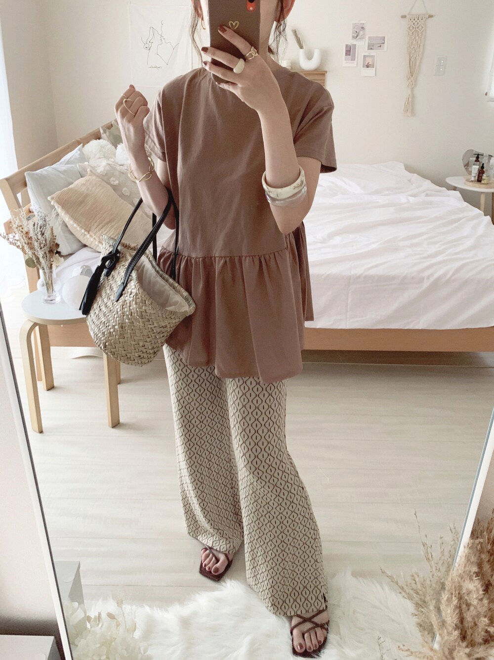 dakuyanさん❤️たっくんさん❤️❤️@くうすけ🍀さん❤️先日のコーデを素敵なフォルダに入れてくださりありがとうございました😊❤️とても嬉しいです💕💕 #着回しコーデ recaの裾フリル異素材切替えプリペラムTシャツ 6月22日までタイムセール価格(540円引き)で2100円になってます❗️ 異素材ドッキングデザインのTシャツ💕 裾フリルになっていてシルエットも綺麗です😆 size: M(他L) color:モカ(他ホワイト、ブラック)