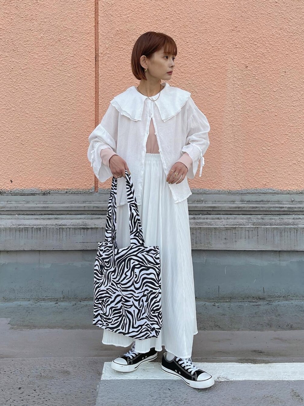 カジュアルガーリーなコーデ🎀 甘くなり過ぎないようにゼブラ柄バッグとスニーカーでコーデを引き締めて。 ビッグカラーのブラウスは付属のリボンが取り外し出来るので、甘さを抑えたくて今回はリボン無しで来ています。ブラウスだけどカーディガン風に着たのがポイントです。 袖の絞りも調節できるので少し腕まくりして袖口からUNIQLOのTシャツを覗かせてポイントにしています。 ピンク×ホワイトでお花見🌸にもおすすめなコーデです。