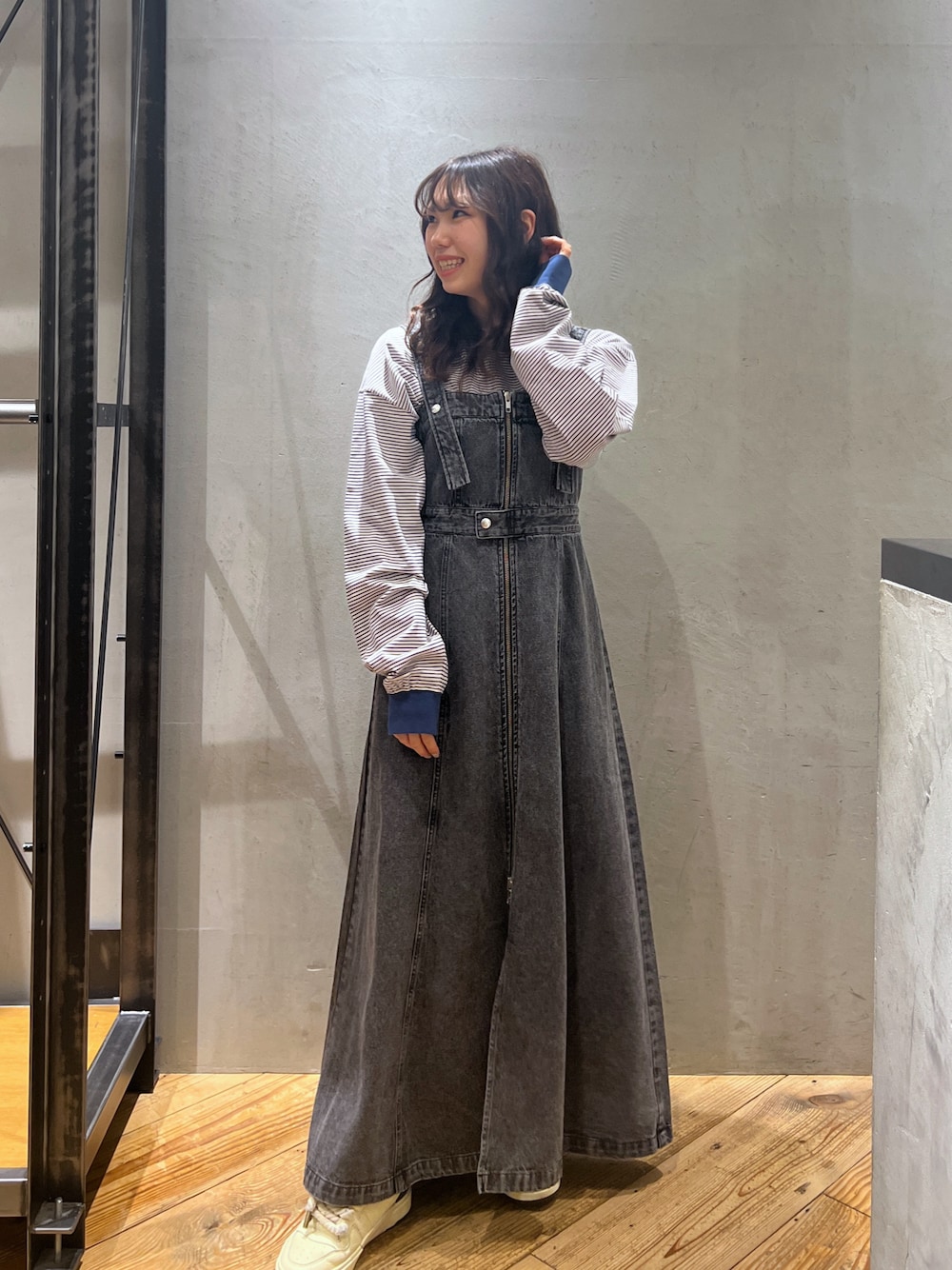 ushikimo2のジャンパースカート「Wジップスリット/フレアデニムジャンスカ」を使ったコーディネート