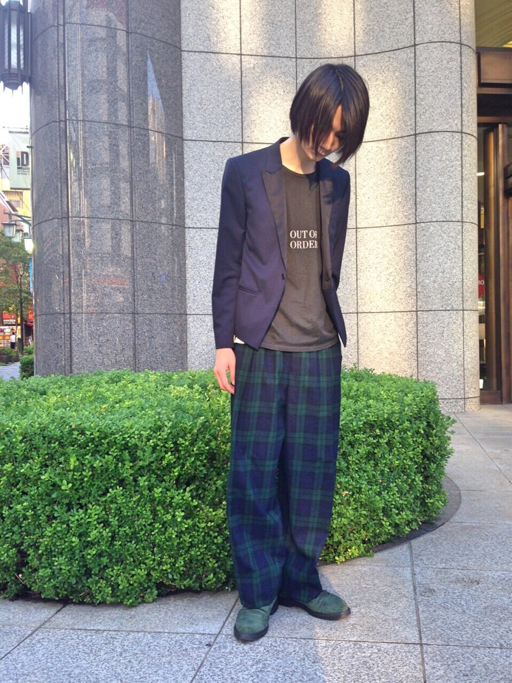 古着ミックスです🐮 ウール地のワイドスラックスで秋冬ぽさを意識しました。 チェックの配色がネイビーとグリーンなので、それに合わせてジャケットと靴の色を合わせています! インナーはお気に入りの今季のカットソーです🐮 インスタグラムアカウント→@1_SYUN_USHI