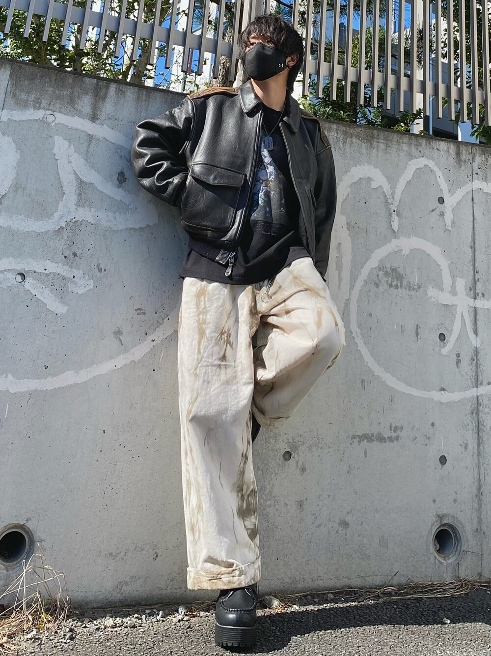 トレンドガン無視のオレ流ストリートスタイル AVIREXのA-2ホースは世界がなんと言おうとバカカッケーのよ プリントシャツとデザインパンツでゴリッゴリにカジュアルに!振り切る時は振り切るのが自分流です アウターは80年台のもので、パンツは2022AW最新作……ワクワクしませんか?僕はします
