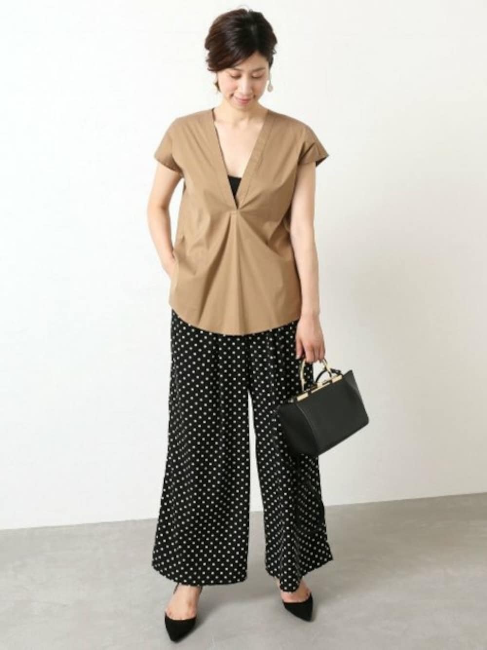 ストレッチが効いて着心地抜群のブラウス。 深めのVネックが女性らしく、シャープな印象をプラスします。 ドットプリントのボトムと合わせてトレンドライクな着こなしに。