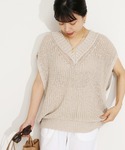 テープヤーン(幅広のテープ形状の糸)から編み立てたローゲージのサマーニット。 接地面が少なく、肌へまとわりつかないので、風通しの良い一枚です。 狭めのVネックと、広めのアームホールという緩急のバランスが絶妙。 リネンよりコットン多めの組成なので、リネンニットによくあるチクチク感は気になりません◎ キャミソールの上に一枚で着ても、ベストのようにレイヤードしてもOK! カラーパンツのビビッドさをマイルドにしてくれる優しいベージュの色味も◎