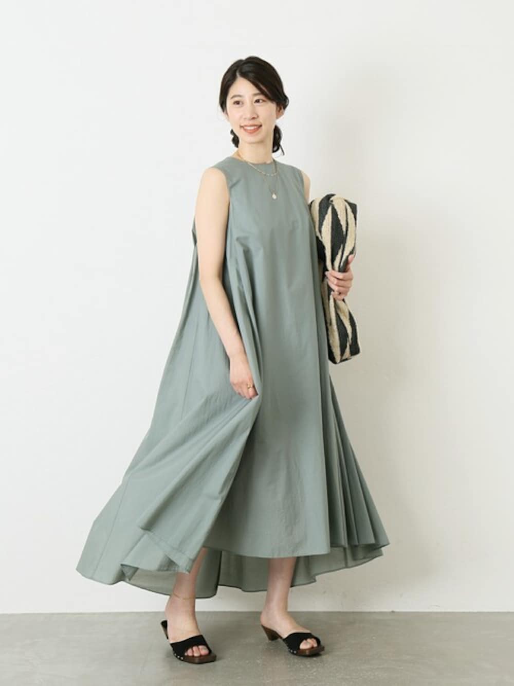 【HAVEL studio/ハーヴェル スタジオ】からセレクトしたこちらのワンピース。 裾に向かって緩やかに広がるAラインのシルエットと、動くたびに揺れるたっぷりとしたドレープが美しい一枚。 ナイロンを配合しているので軽い着心地で、盛夏までお召しいただけます。 グリーンにカーキとグレーを混ぜたようなニュアンスカラーもツボです♪ 後ろ下がりのデザインで、前は脛の真ん中あたり、後ろはマキシ丈になりました。 S、Mの2サイズ展開ですが、肩幅と身幅にはそこまで大きな寸法差がありませんので、 お好きな着丈でサイズをセレクトしていただくのも良いかもしれません◎