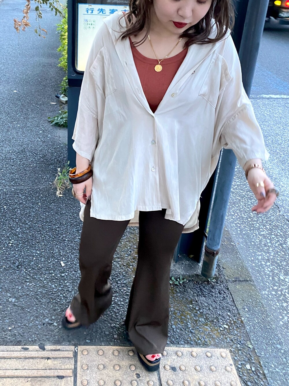 アングのシャツとタンクトップ着回し😊 ほんと可愛いよねサテンシャツ〜! わたしのイチオシのGUのリブフレアパンツ!黒とこのブラウンを2色買い🤣 めっちゃ盛れるし鬼楽〜 143センチでSサイズ!なんとか丈もいい感じに履けます🙆♀️💕 秋服も着々に揃えてて、冬もアウター何を予約しようかとワクワク😳笑