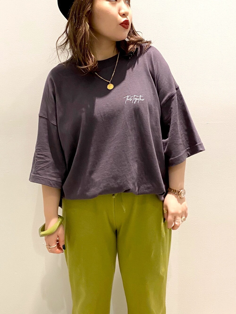 今日のお洋服💚 口ちょっととんがらせててごめんなさい😂😂笑 バックフォトも可愛いジーナのTシャツ😍 めっちゃオーバーサイズなのでわたしはインしたよ👀 これ買うとチャリティーにもなるらしくて〜デザインも可愛いし素敵💰 パンツは着回しのkastaneのジャージのやつ〜ほんと楽で可愛い〜🍈