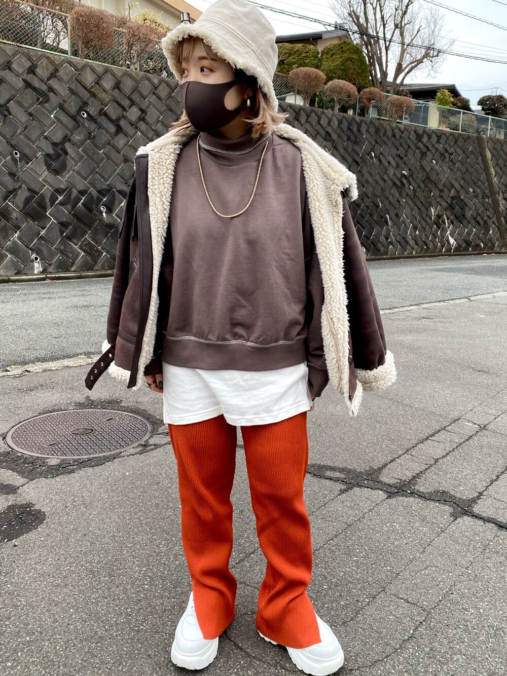 本日の休日コーデ☔️⛄️ 今日は寒いと思って、アングのアウターが着たくてそれに合わせたコーデ😆 最近getしたkastaneのレギンスパンツも色味が最高🍊長さ心配だったけどウエストガン上げして折れば小柄さんも履けます!👌🏻 ブラウンとオレンジ合わせおすすめ☺️