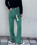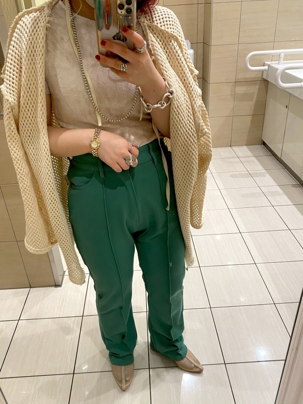 この前の休日💚🍡 レイビームスのベロアTおすすめ😆 カラーも全部可愛くて、もう一色買おうか悩み中です🤣 kastaneのスラックス丈詰めてません! グッと上にあげるとギリギリたるむこともなく履けるけど、油断してるとウエスト落ちてきて擦りそうになるのでベルトがおすすめです🥺この日してなくて失敗🥺 小柄さんご参考に〜💖