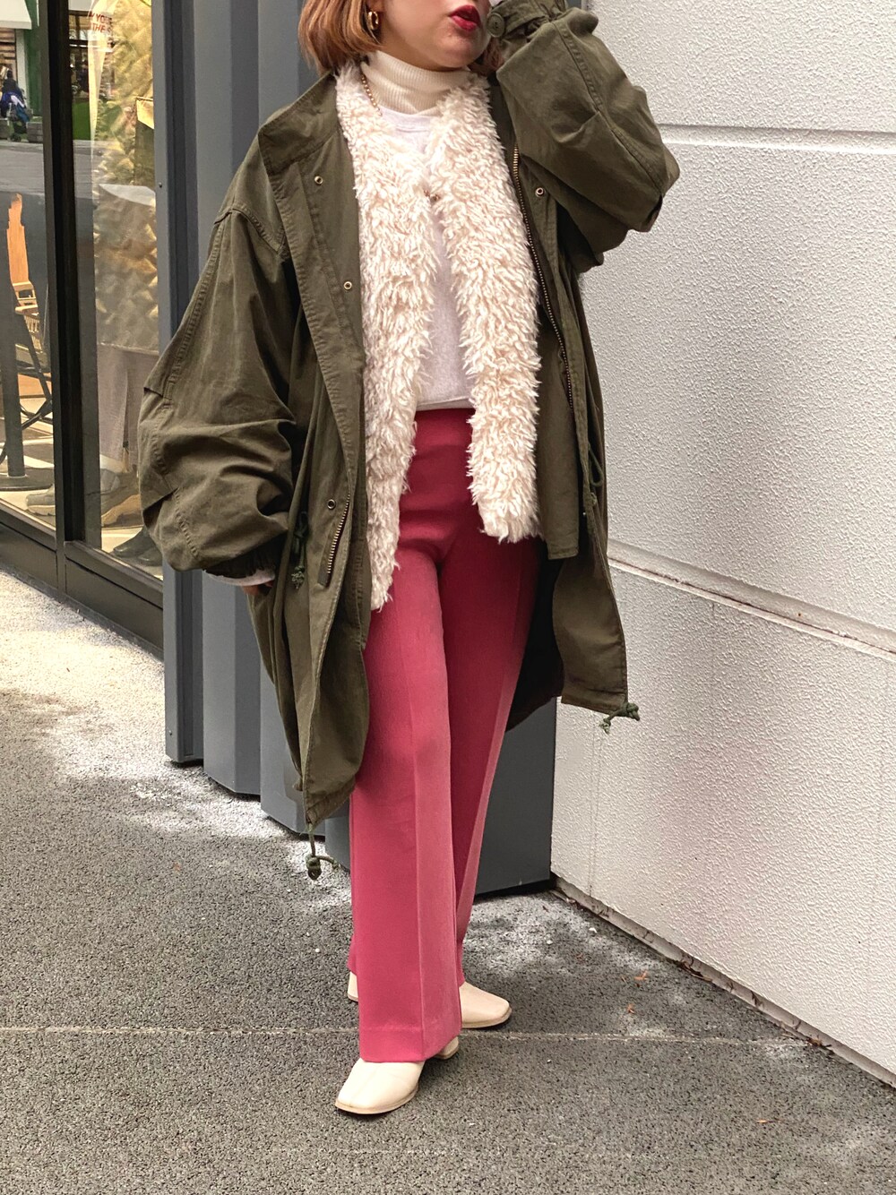 この前の休日コーデ⛄️⛄️ モッズコート×ファーベスト🤍🤍🤍 最高に可愛くて暖かい組み合わせ🥺❄️ 差し色でボトムはピンク🍑