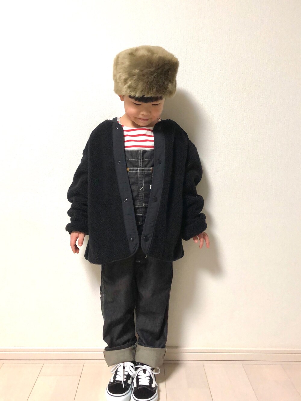 覗いて頂きありがとうございます! UNIQLO キルティングボアフリース リバーシブルジャケット #冬アウター着回しチャレンジ その3 ボア側で着用☺️ 久々にスリコのロシアン帽で♡ アウター▷130cm 身長▷110.1cm 体重▷19.3kg