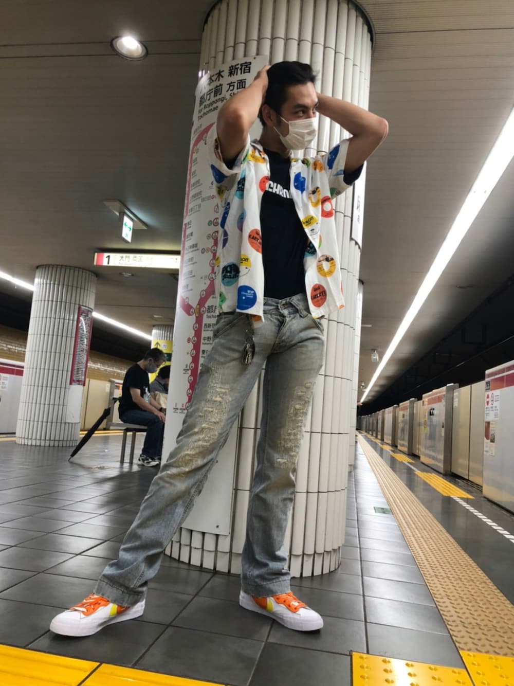 夏は爽やかに 久々にクローゼットから出したドルガバのパンツは調子良すぎ🔥 めちゃローライズなのがいい感じ スニーカーは今っぽくsacai×NIKEで 白にオレンジと黄色のスウォッシュがめちゃ爽やかでかわいい🍊🥴 シャツもお気に入りのカーハート