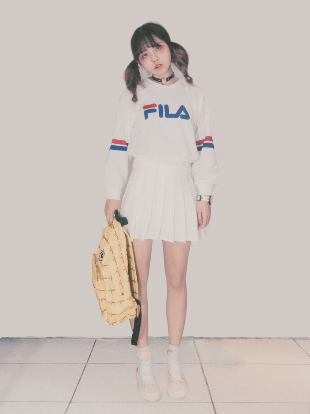Top: WEGO X FILA Bottom: American Apparel Legwear: WEGO Shoes: Comme des Garcons X Converse Choker: no brand Bag: hype Watch: Swatch X Lorenzo Petrantoni