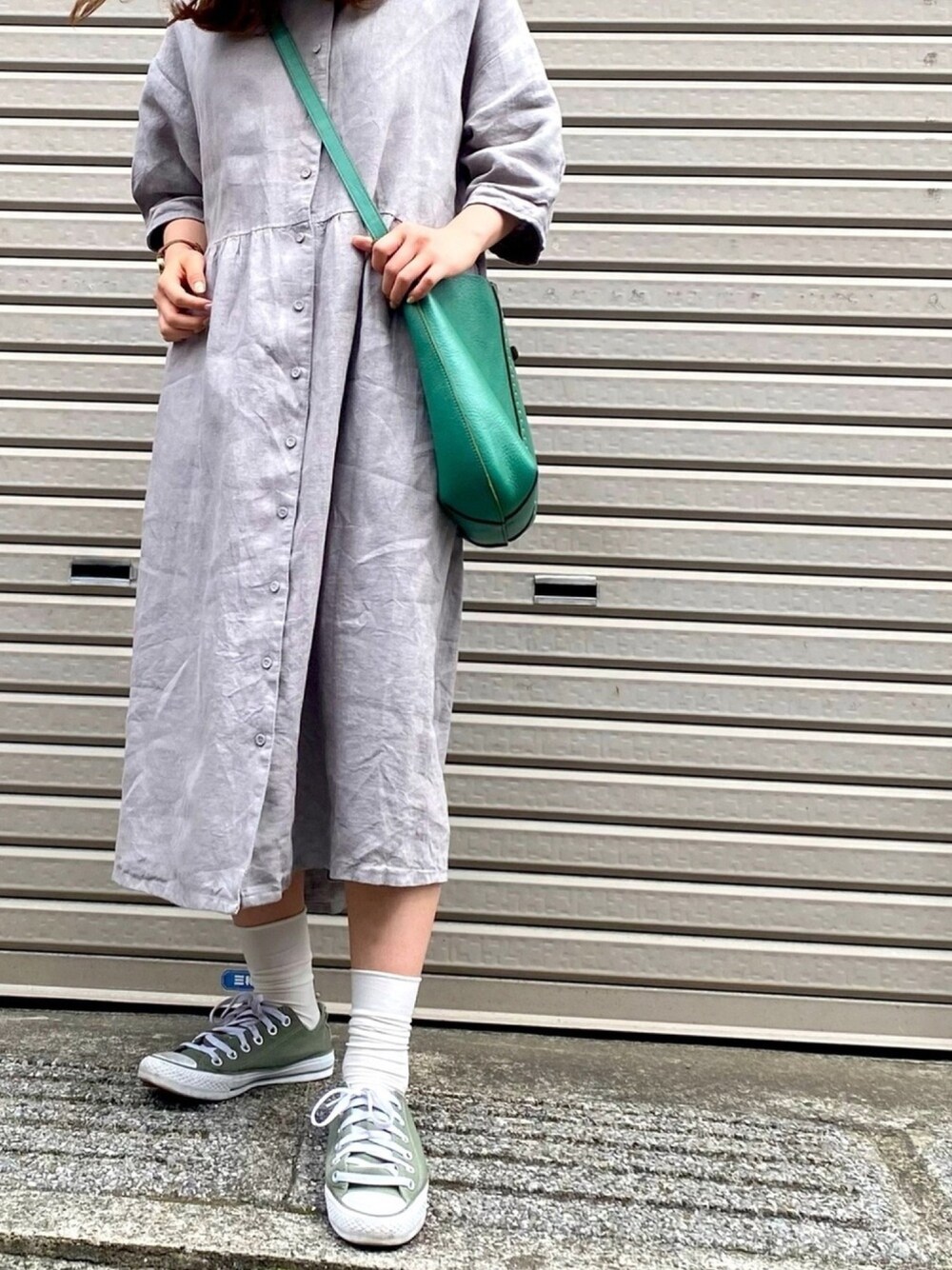 ゆづたけのワンピース「リネン前後着七分袖ワンピース」を使ったコーディネート