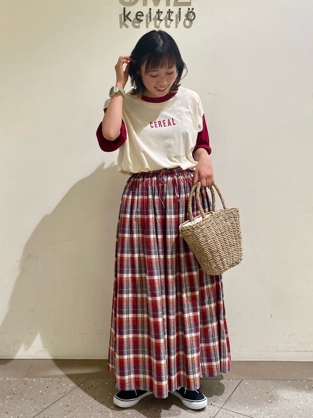 カジュアルガーリーコーデ🍒 ロゴと配色がとってもかわいいTシャツにボリュームのあるチェックスカートを合わせてみました🫶✨ 今年はピンクや赤のアイテムが多くて嬉しいです(*^^*) 本日はプレミアムフライデー🌟ですね! 店頭では一点でも20%オフの1日限定イベント開催いたします! 土日暑くなりそうなので夏物揃えるチャンスです☘️💕 是非お越しくださいませ^_^