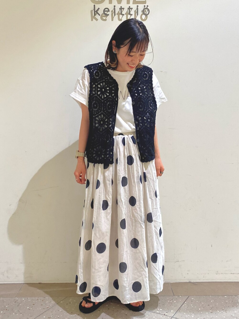 サマンサらしいモノトーンコーデ🐾 春に大人気だったかぎ針編みベストの夏バージョンが入荷してます🪡💕 前開きにすることで縦のラインが出てすらっと細見えします😳❤️ 店頭では先行セール開催中です!🍦 夏物MAX50%OFFと大変お買い得になっております☺️🎶 スタッフ一同心よりお待ちしております🧸✨