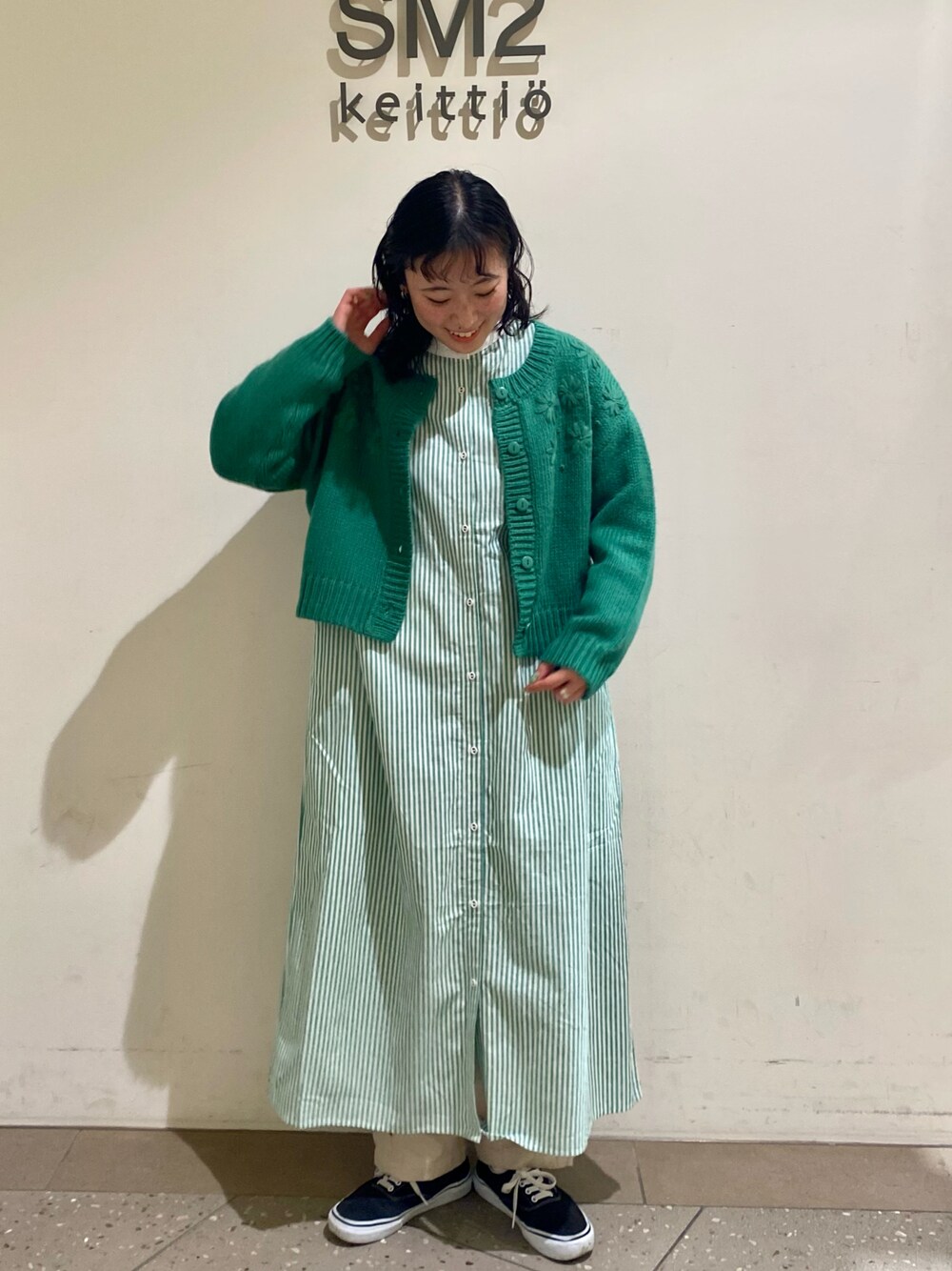 さわやかグリーンコーデ🌱 丈の短いカーディガンはワンピースにパンツのゆるっとした合わせにもズルズルしすぎず合わせやすいです✨ 春が近づくと色物を楽しみたくなりますね☺️