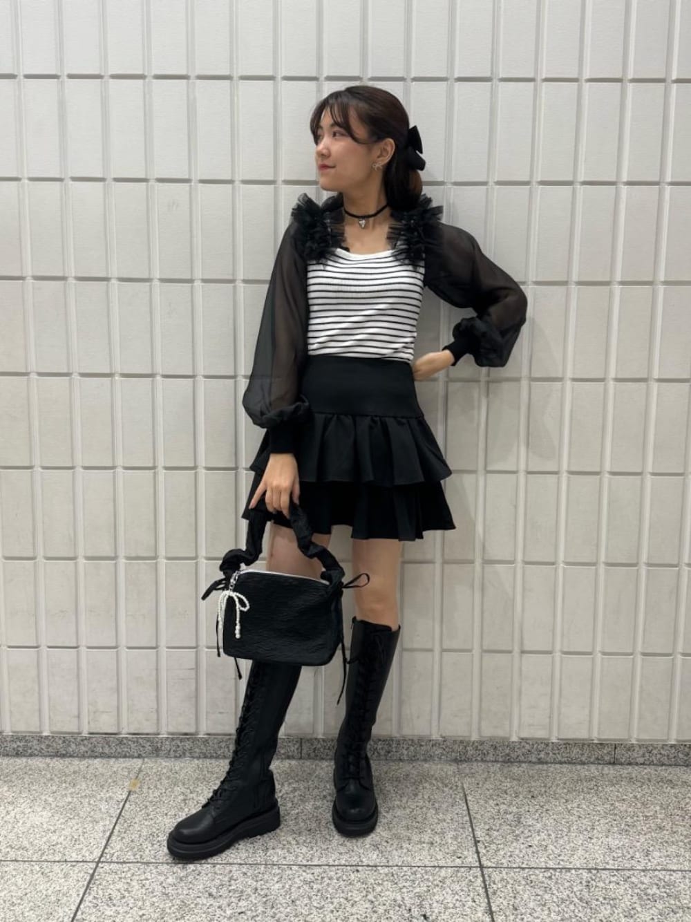 トレンドを詰め込んだモノトーンコーデ🐈⬛❤︎ニットは薄手素材になっており、お袖もシアーなので今の時期から着て頂けます◎バッグは9/12~始まるノベルティフェアのもので、今回はリボンチャームがついたバッグをプレゼント致します👜🫧