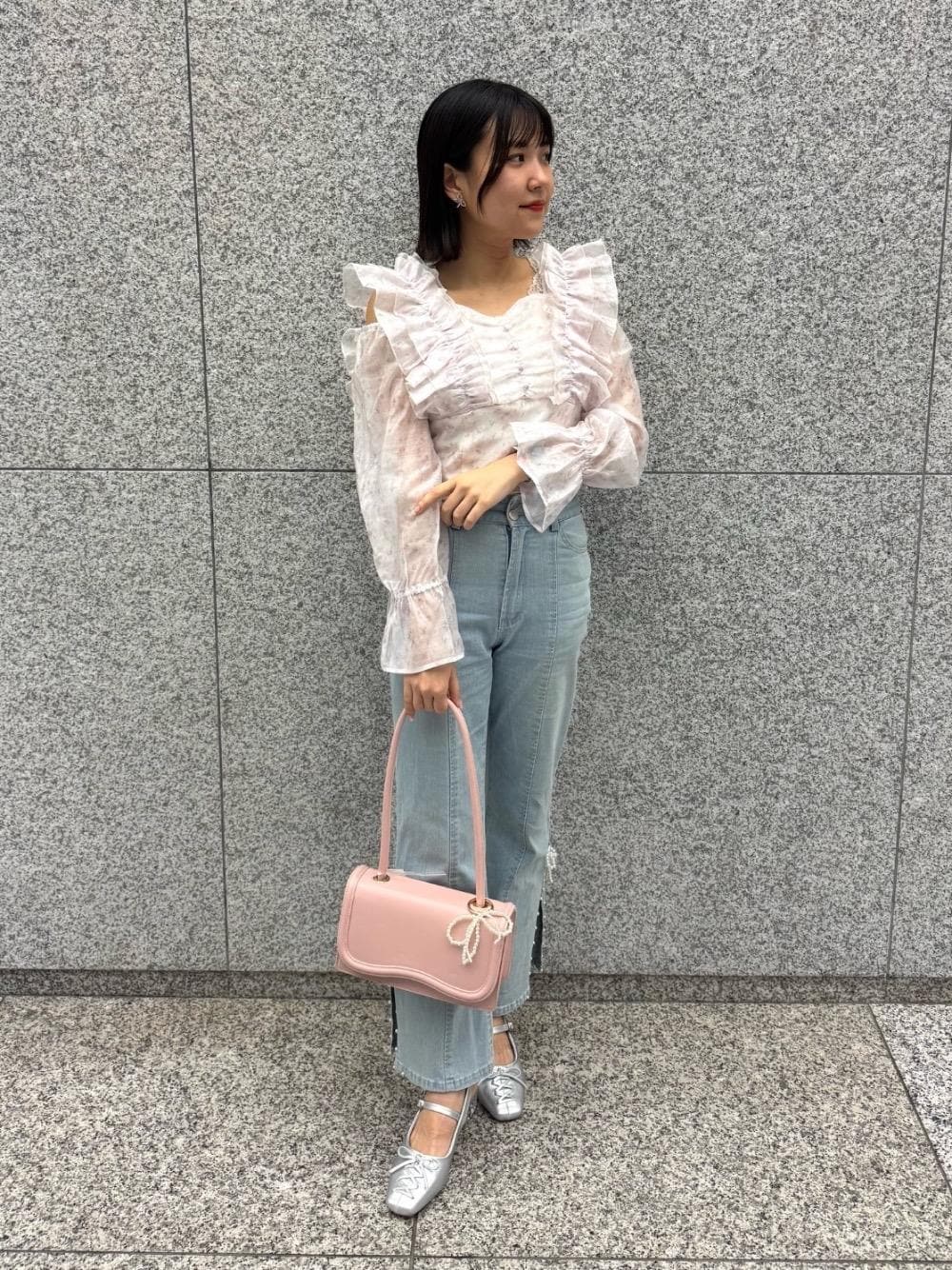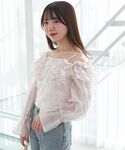 お花見にぴったりのピンクコーデ🌸フリルがたっぷりのブラウスですがデニムと合わせると甘さを抑えることができます👖◎お袖の透け感と肩がちらっと見えるのもポイントです🐰🎀