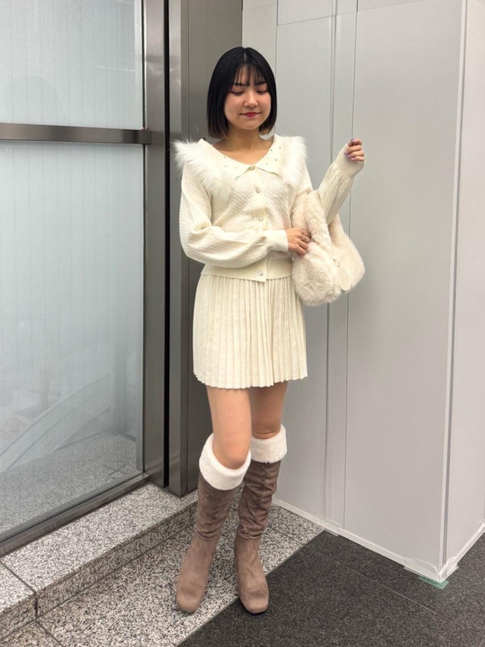 ファーとビジューが今の季節ぴったりのデザイン❄️小物もファーでまとめて統一感up🐏🤍バッグは10/30~スタートしてるノベルティフェアのバッグです☁️