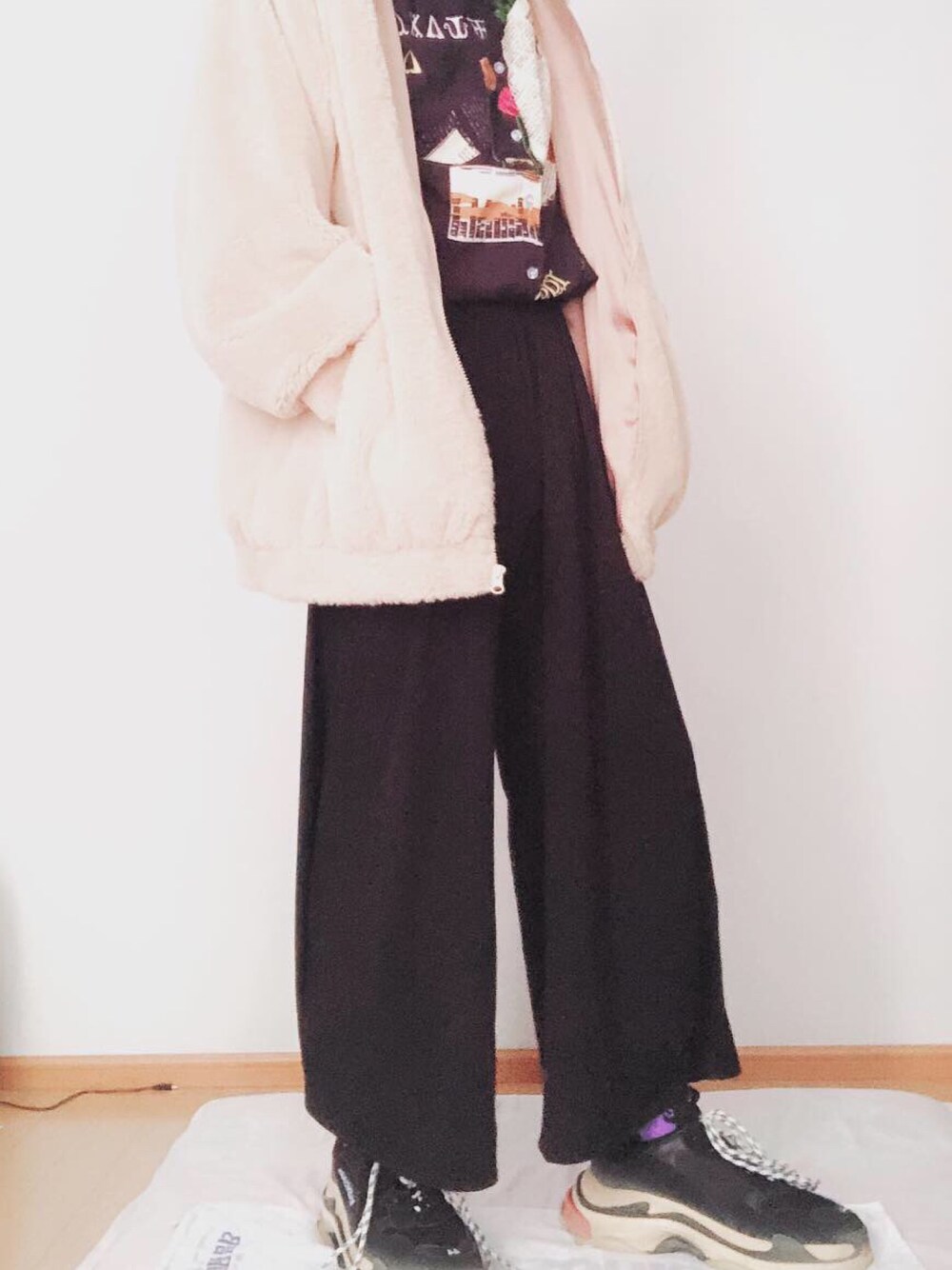 . . . 気温的にはあったかいけど、風が冷たい中途半端な季節ですね🙂 どちらにも対応できるように薄手の柄シャツにモフモフアウター🔥 靴抜きで全身8000円のプチプラコーデ😍😍 . . .