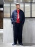 差し色のレッドがアクセントの効いたアメカジコーデ。 短丈のワンウォッシュデニムブルゾンとレイヤードで差し色をチラ見せするのがポイント。 パンツはレッドを誇張する為、ブラックをチョイスして大人っぽさもプラス。