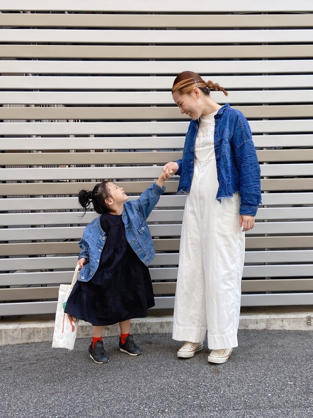 #デニムジャケット でリンクコーデ この前お花見に行った時のコーデ🌸 薄色デニムがだいすきなかあさん 必然的にむすめにも着せる〜 ちょいちょいおかん登場すみません むすこともオーバーオールリンクしてたので また載せますっ