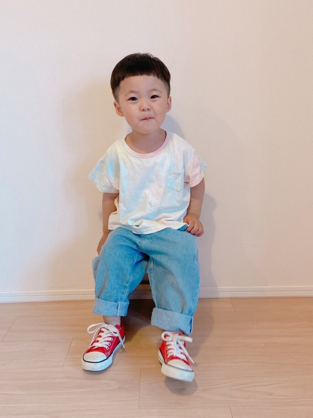 #タイダイ柄 去年買ったマーキーズのTシャツ そらがおなかにスライム付けてパリパリになってるやつ… 保育園着でございます そろそろうたとそらのサイズ感に差がなくなってきたな…