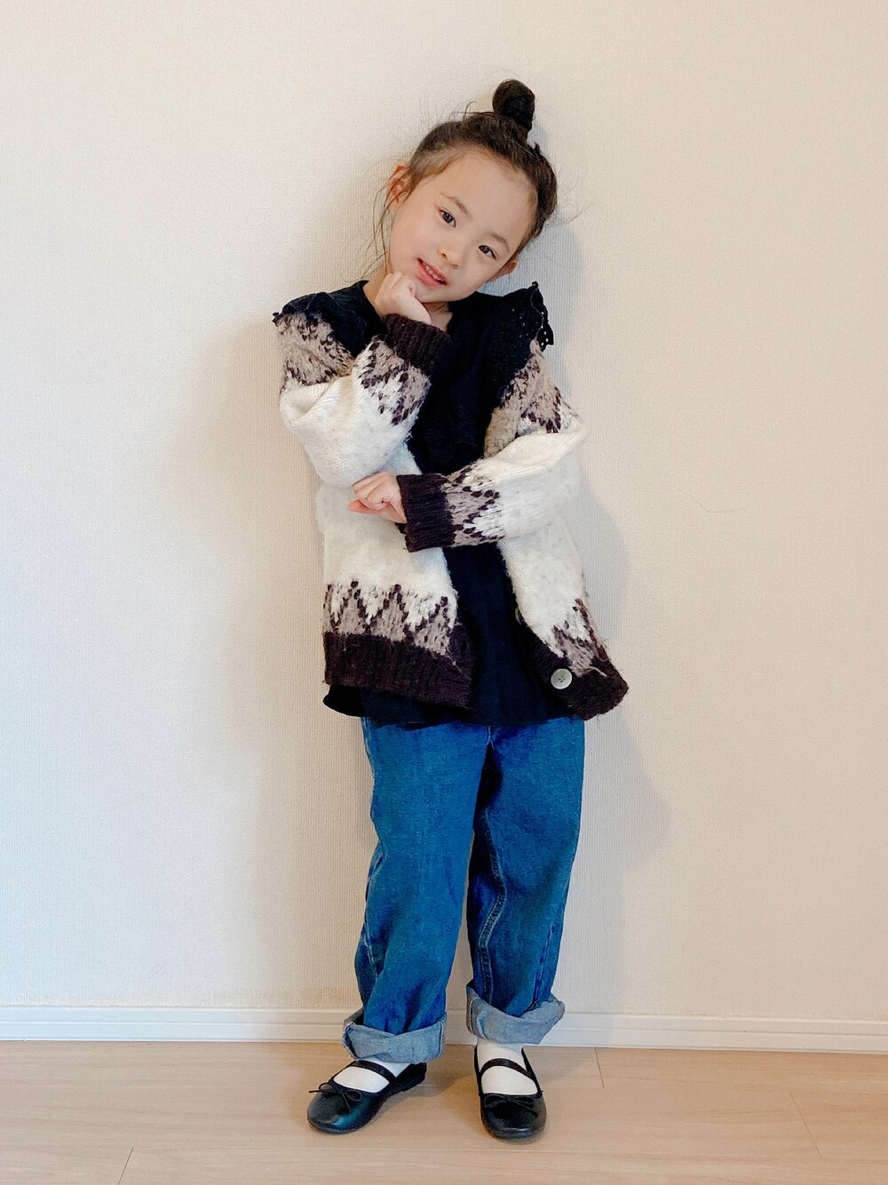 #ノルディック柄 このポーズはなんだろな ビッグカラーをジャガードニットにon🧶