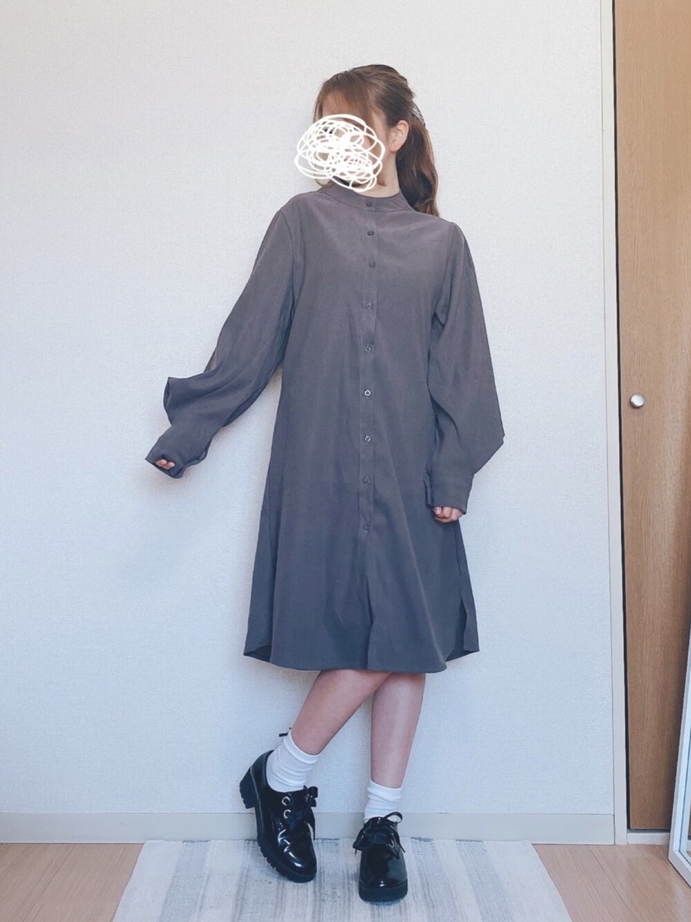 なんのシャツワンピース「バルーンスリーブ クルーネックシャツワンピース」を使ったコーディネート