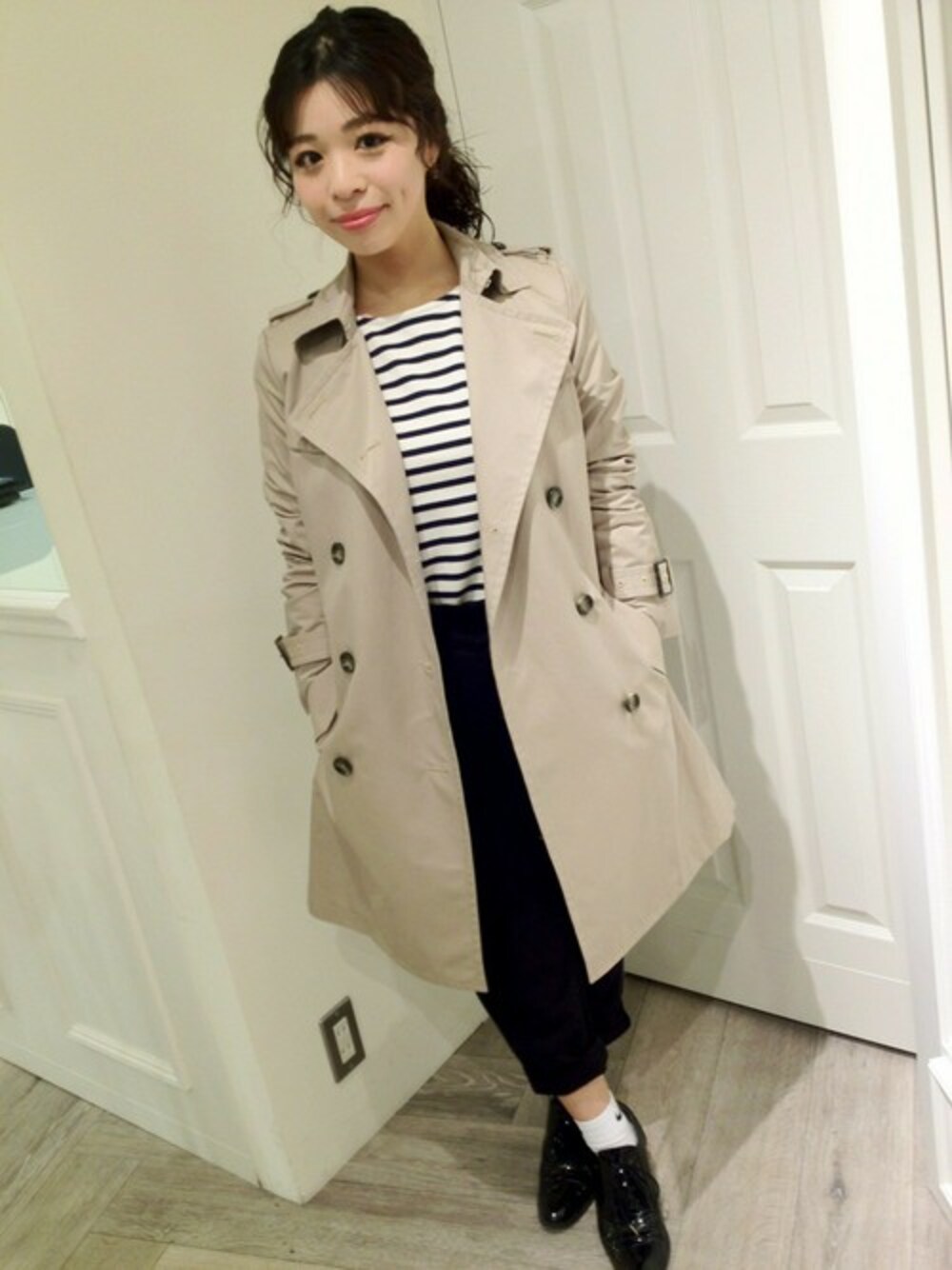 春のおすすめトレンチコーディネート!! トレンチのインにボーダーカットソーをコーディネートする事で最強のコーディネートが出来上がります。 今年はパンツスタイルでクールにまとめるのをおススメします。
