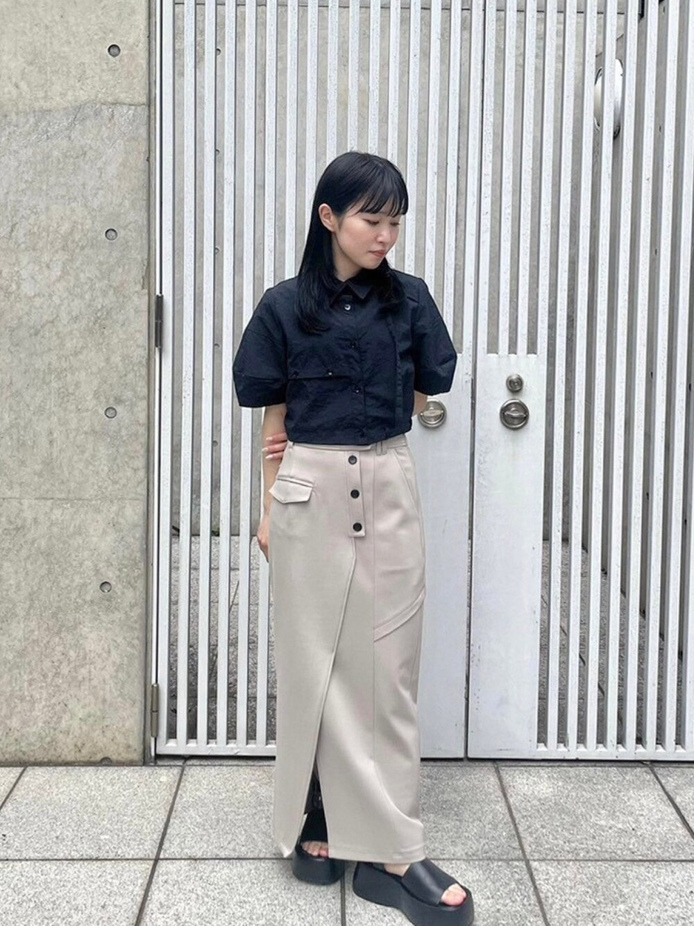 大人っぽくみせてくれるコーデです! シャツの丈感が小柄さんでもバランスよく着られます。
