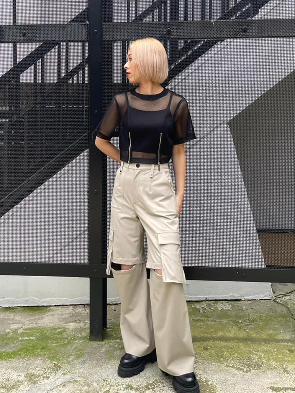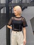 メッシュトップスは上半身がコンパクトに見えてオススメです!中にシアートップスなどを合わせても◯