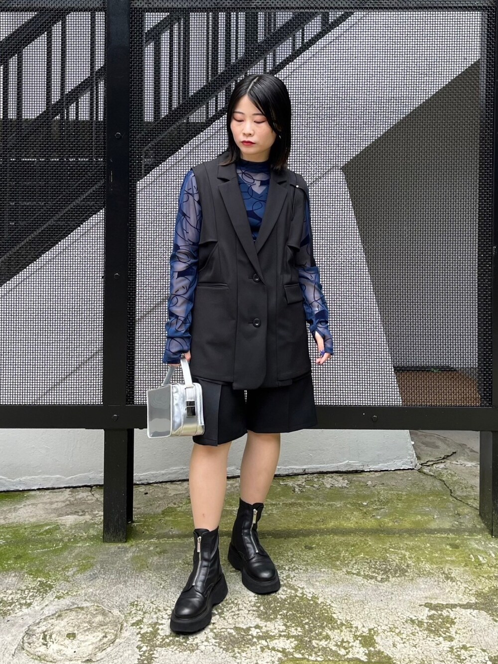モノトーンコーデに、ネイビーで差し色を入れました!シアー感があり、オールシーズン使えるトップスです!