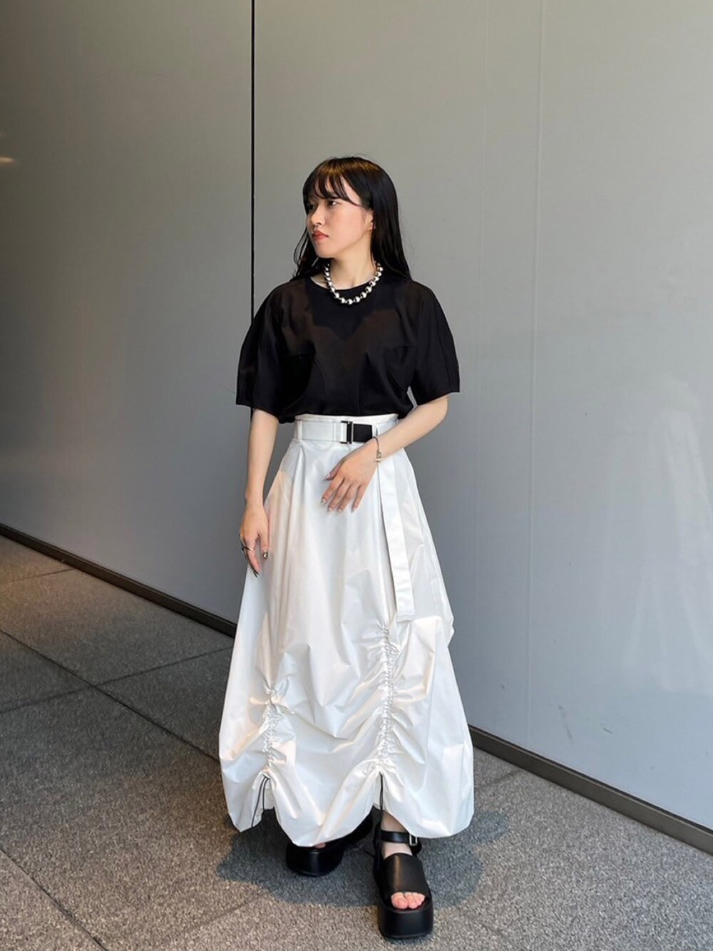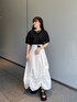 変形トップスとデザインスカートでシンプルかつ個性的なコーデに!