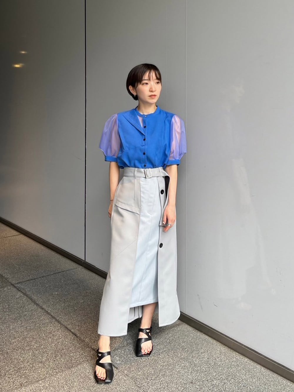 ブルーのブラウスが夏らしいコーデです!オフィスカジュアルにもおすすめ。