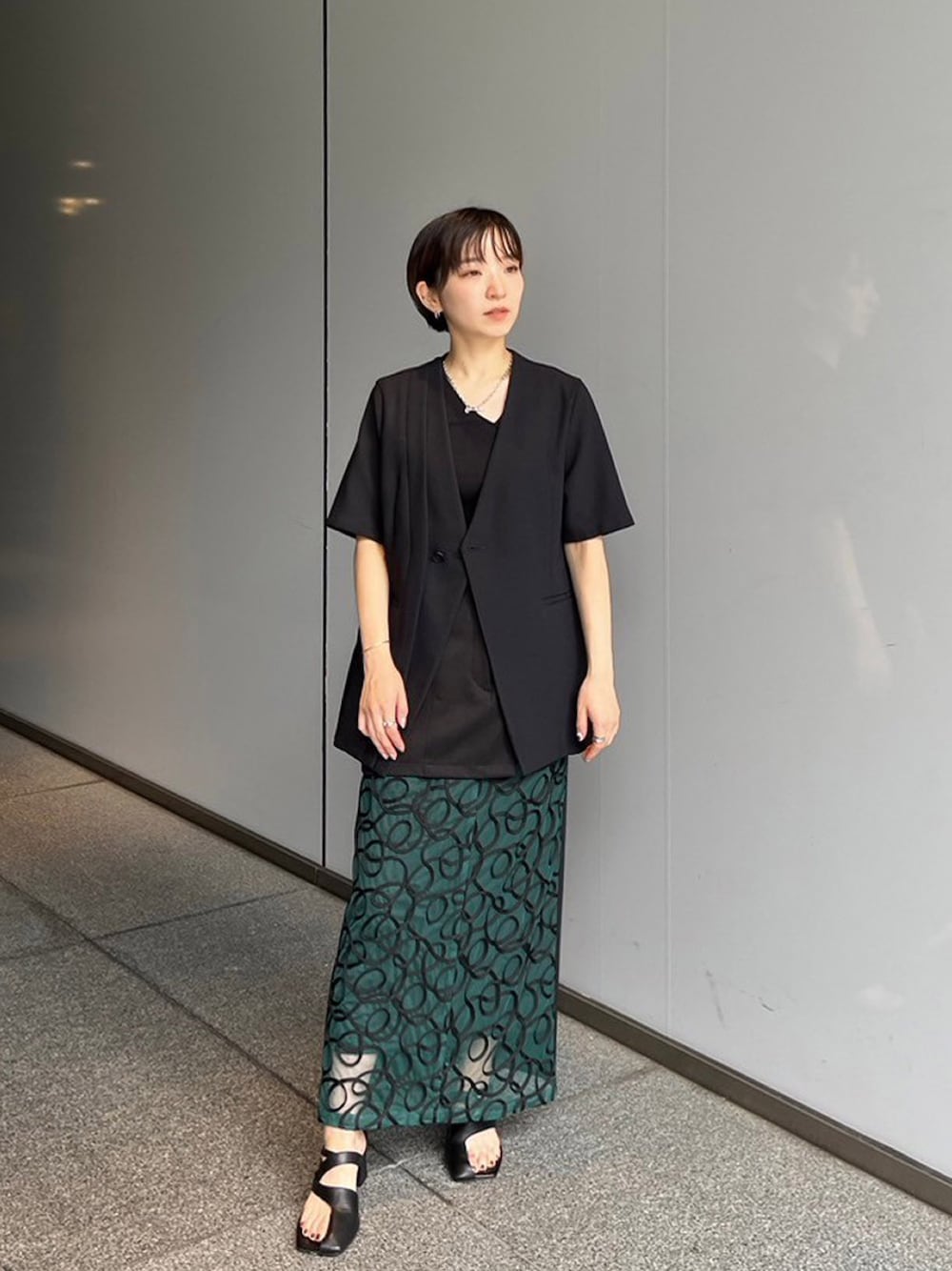UNITED TOKYO STAFF(UNITED TOKYO)のノーカラージャケット「【残りわずか!】シアーカラミハーフスリーブサマージャケット|ウォッシャブル/防シワ/オフィスカジュアル/半袖」を使ったコーディネート