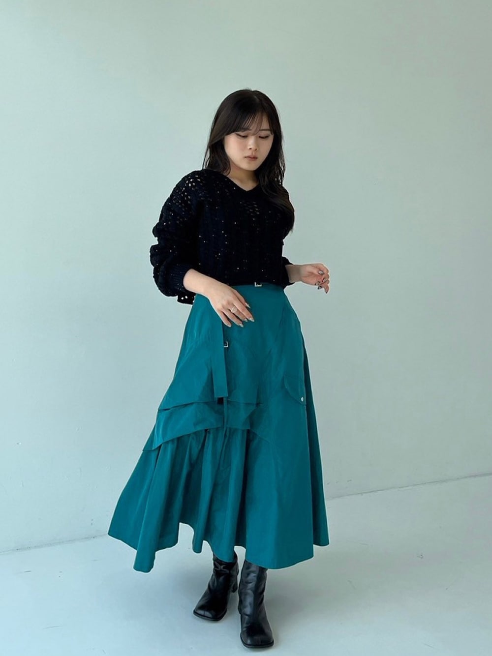 グリーンが目を惹くコーデ。ニットはキラキラがポイントです!