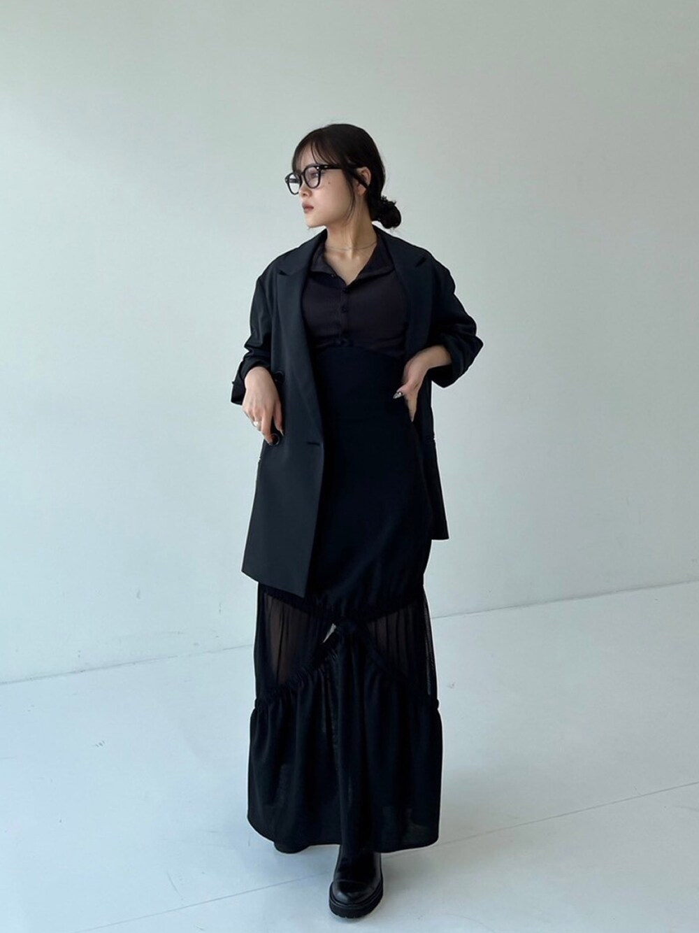 かっこよさと女性らしさもあるオールブラックコーデ。