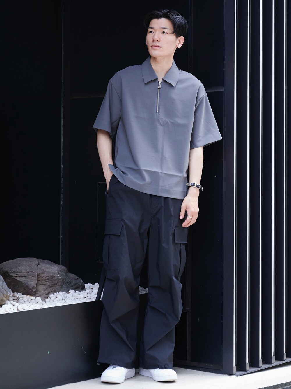 Asami Hareruya(UNITED TOKYO)のポロシャツ「ストレッチツイル ハーフZIPポロシャツ(半袖)」を使ったコーディネート