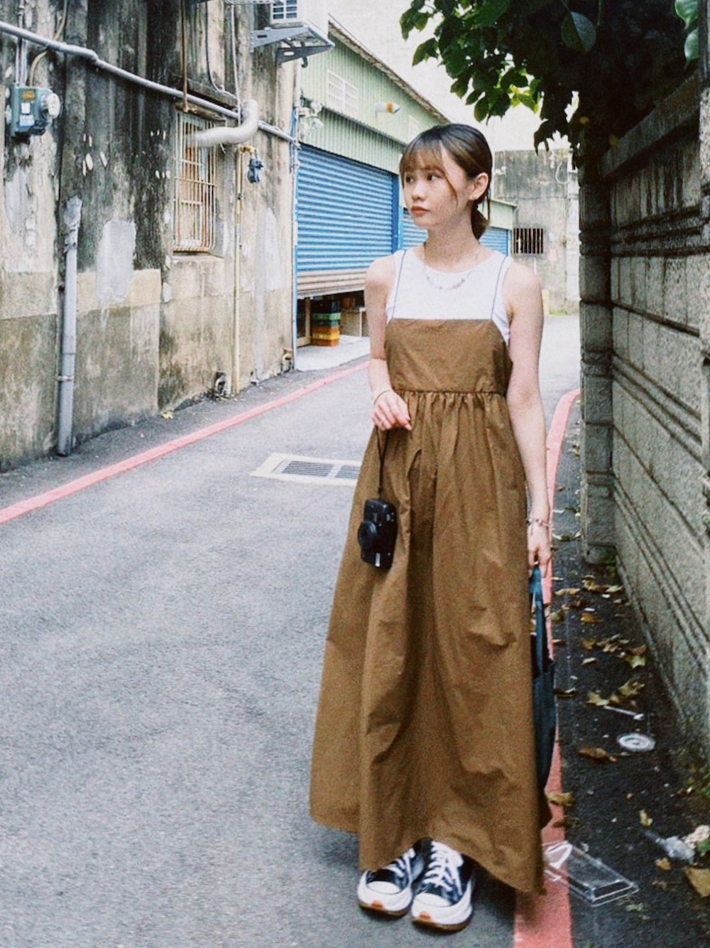 ブラウン系のワンピースを着用したレディースの春コーディネートの1枚目の写真