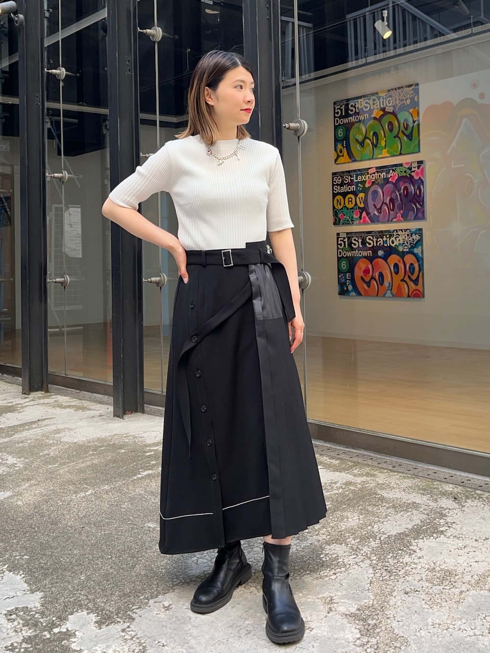 シンプルなカットソーに一枚で主役になるスカートを合わせてこなれ感のあるコーディネートにしてみました。スカートは、はり感のある素材できちんと感を演出してくれるのでデザインスカートでも大人の印象に。