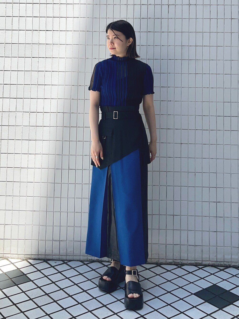 ブルーxブラックでクールな大人綺麗目スタイルにしてみました。ブルーブラックの落ち着いたトーンですが、夏にも重たくならずに合わせられるアイテムです。トップスのシアー感は程よく、一枚メインで着るのも◎ジャケットやカーディガンのインナーでアクセントにも◎