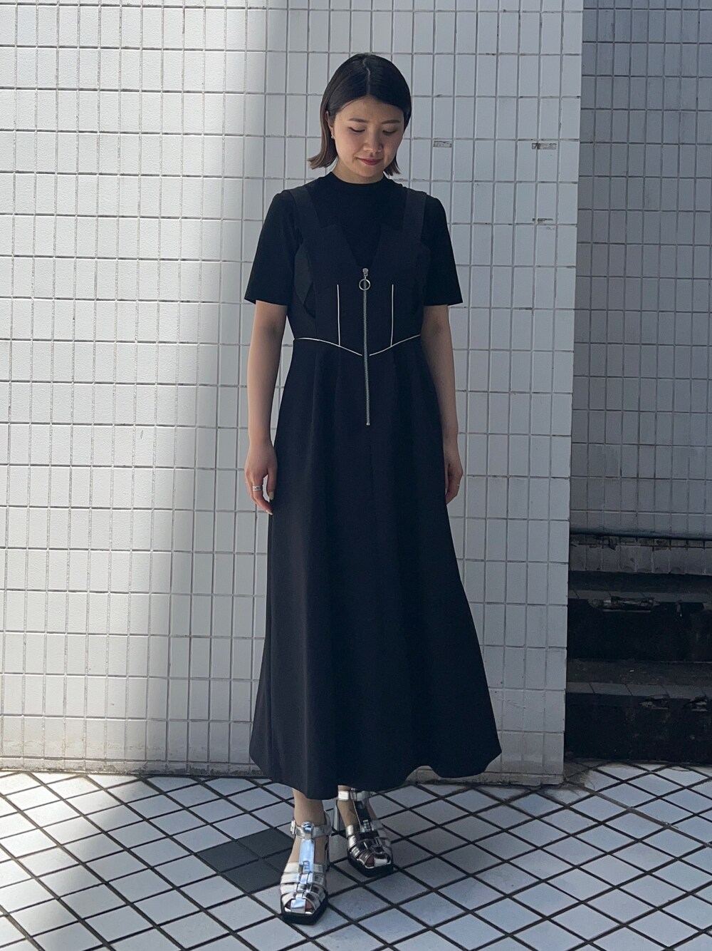 オールブラックの合わせにメタリックな足元にし、大人可愛いモードスタイルにしてみました。 ホールド感あるスリムなシルエットのジャンパースカートは、バックデザインのバンドがゆとり感がありリラックスして合わせられます。ウエスト位置が高く絞られているため、足長効果抜群なのも嬉しいポイントです◎