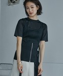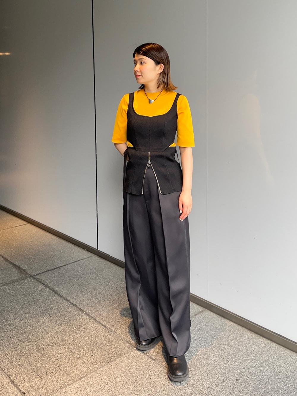 差し色を入れてモードなレイヤードスタイルにしてみました。クロップド丈ニットとセットのビスチェをカラーニットに変えてかっこいいカラーコーデに。ウエストのカットデザインがウエスト位置を高く見せてくれるのが嬉しいポイント◎