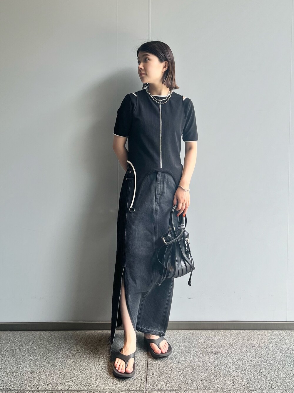 デザインカットソーにデニムスカートを合わせて大人カジュアルコーデにしてみました。マキシ丈で落ち感のあるシルエットにトップスのアーチデザインの裾がバランスよくモードな印象に。足元をラフにすることでこなれ感を演出。