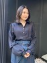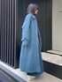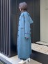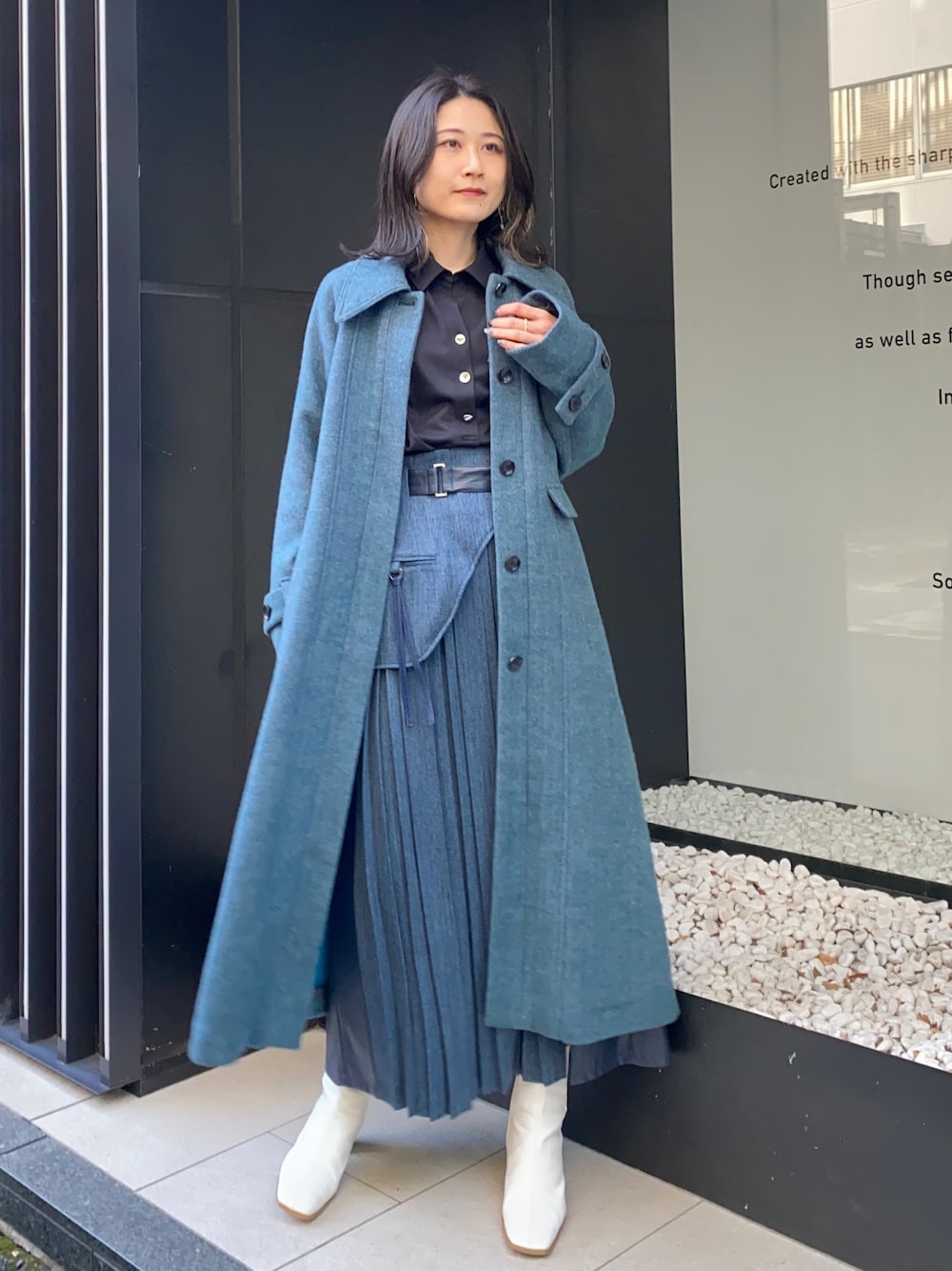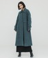 全体をブルーグリーンでまとめてみました。 ステンカラーのコートは少しAラインに広がるので、プリーツのフレアスカートと相性抜群です。 ブラウスは胸元のホックを開けるとイメージが変わり、フェミニンすぎない印象に。