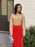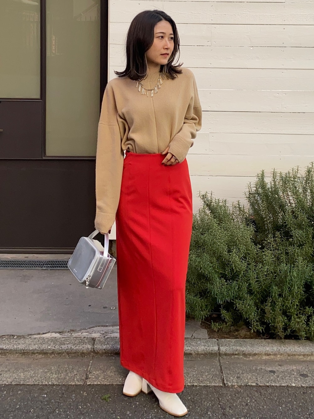 カジュアルでシンプルなニットは綺麗目スカートや華やか小物と一緒に。