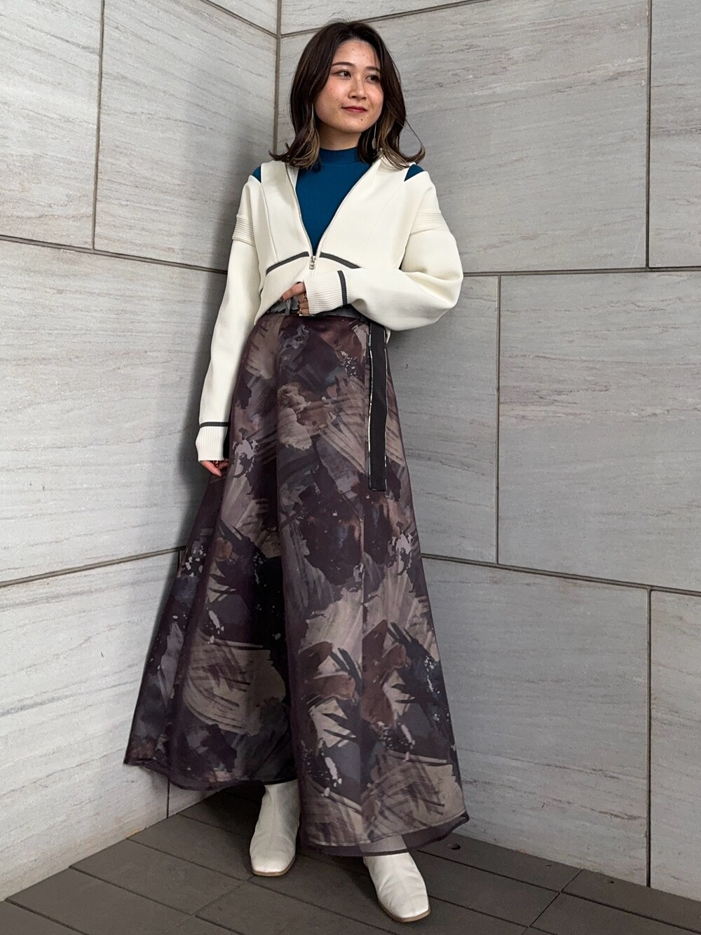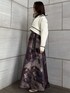 暗い色でも春を演出してくれるオーガンジー素材が重なったフレアスカートは、 ショート丈のニットと合わせてカジュアルミックスでトレンド感高めのコーディネートに。