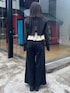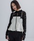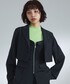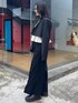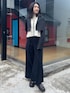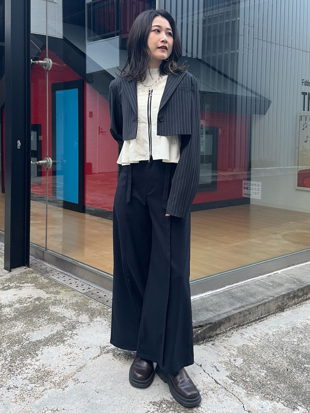 裾にボリュームのあるビスチェとショートジャケットを合わせて、脚長効果のあるスタイリングです。