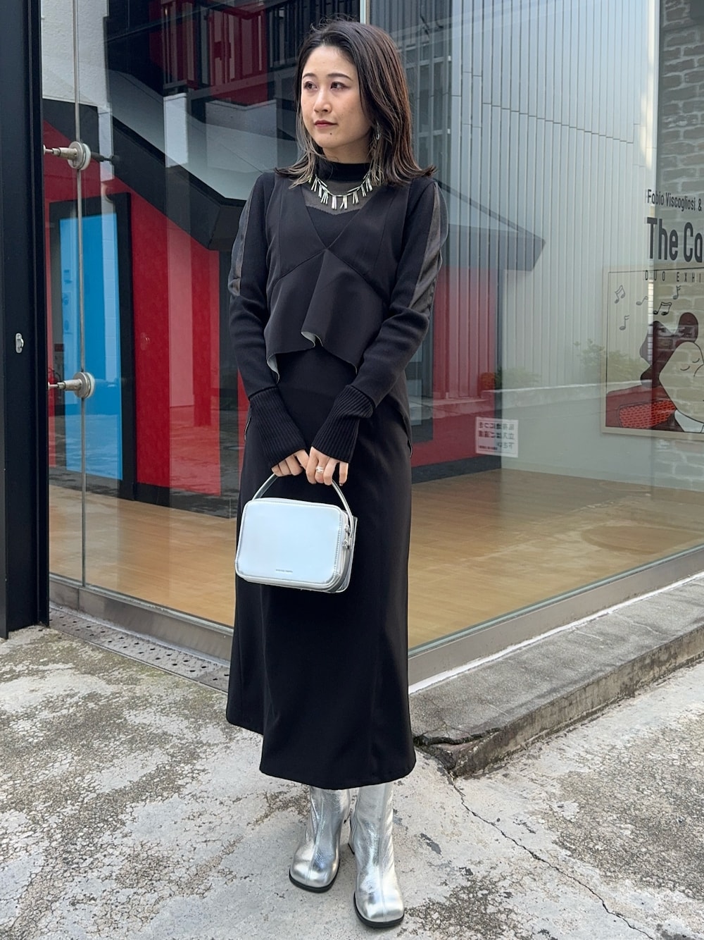ワンピースのウエストのフリル部分は内側がホワイトになっているのがポイント。 シアートップスやシルバーカラーのアクセサリーと合わせた、オケージョンにも使えるコーディネートです。